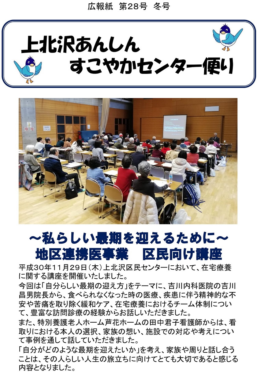 今号では、平成30年11月29日に開催しました区民向け講座「私らしい最期を迎えるために」の様子を報告しています。当日は、吉川内科医院の吉川院長や特別養護老人ホーム芦花ホームの田中看護師から、緩和ケアや看取りについて講義をしていただきました。今後も介護予防や医療など興味のある講座を開催してまいります。