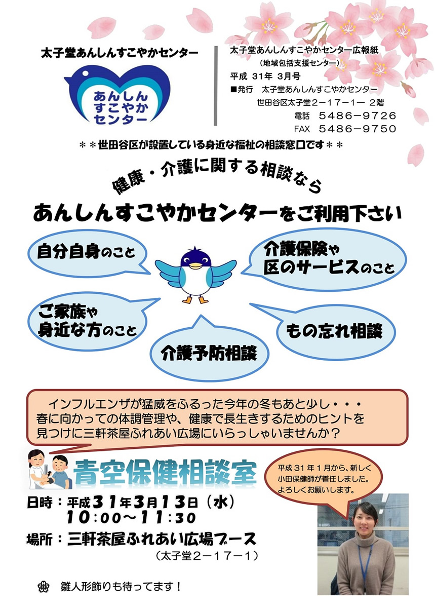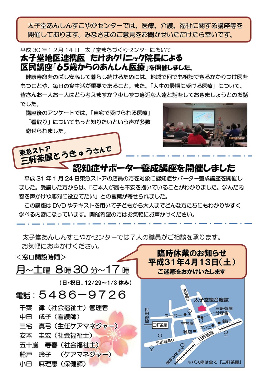 太子堂あんしんすこやかセンター広報紙を発行しました。 今号では、最近行われた事業についてご紹介しております。